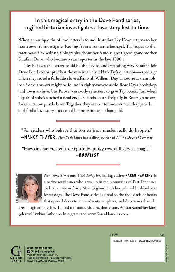 When an antique tin of love letters is found hidden in her family home, noted historian Tay Dove rushes home to Dove Pond to investigate. Tay is still reeling from a romantic betrayal, so she’s relieved to refocus her energies on her latest project: a biography of her great-great-grandmother Sarafina, a star reporter who began her career in Dove Pond in the late 19th century before abruptly leaving town.