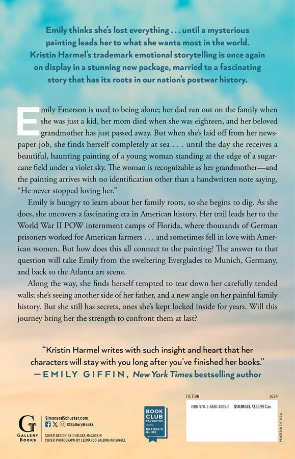 Emily Emerson is used to being alone; her dad walked out on the family when she was a just a kid, her mom died when she was eighteen, and her beloved grandmother has just passed away as well. But when she’s laid off from her reporting job, she finds herself completely adrift…until the day she receives a beautiful painting of a young woman standing at the edge of a sugarcane field under a violet sky. She recognizes the woman as her grandmother, but the painting arrived with no identification other than a handwritten note saying, “He never stopped loving her...”