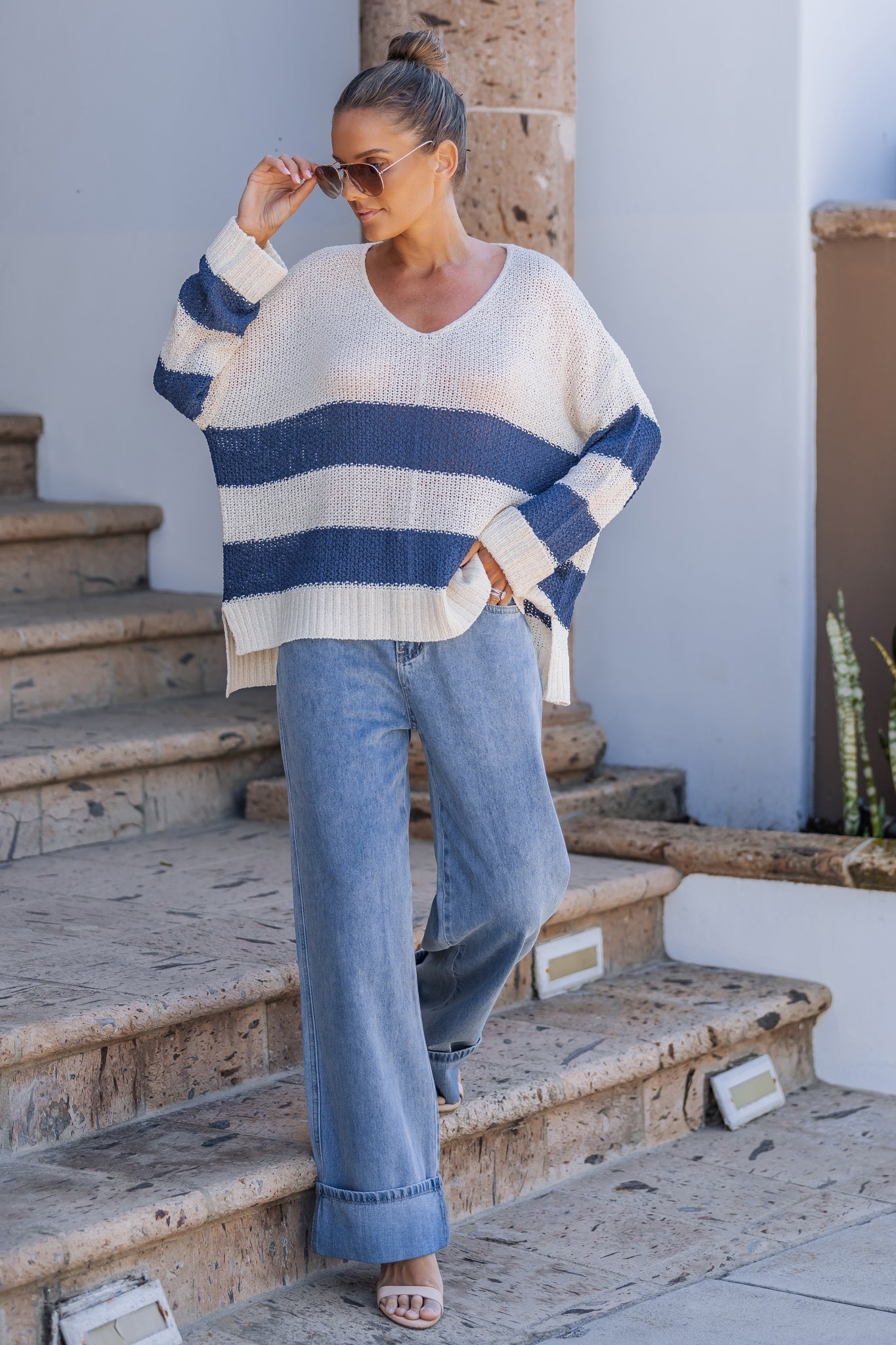 - STRIPED V-NECK PULLOVER SWEATER - HIGH-LOW HEM- 3/4 SLEEVE - SLIT DETAILS ON SIDE