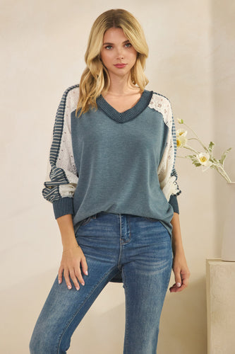 Chestnut Mixed Contrast Sleeve V Neck Top