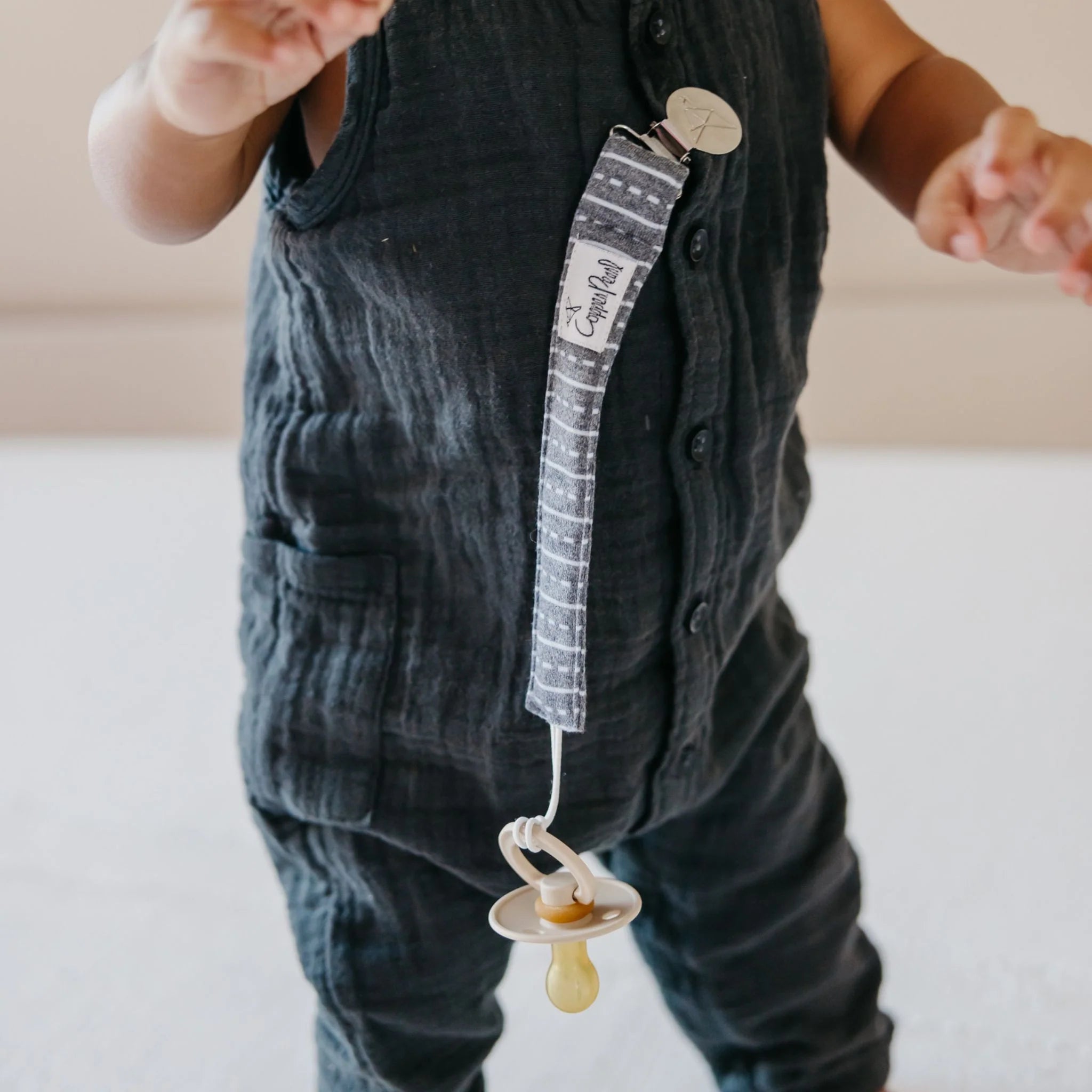 Offering the ultimate blend of fashion and function, our unique Binky Clip features a premium knit strap lined with absorbent fleece to help soak up drool. Simply attach baby's pacifier or teether to one end, then fasten the clip to clothing, blankets or baby gear. Oh, and by the way our set includes three Binky Clips to keep with you wherever you go - no more floor drops or pacifier pick-ups!