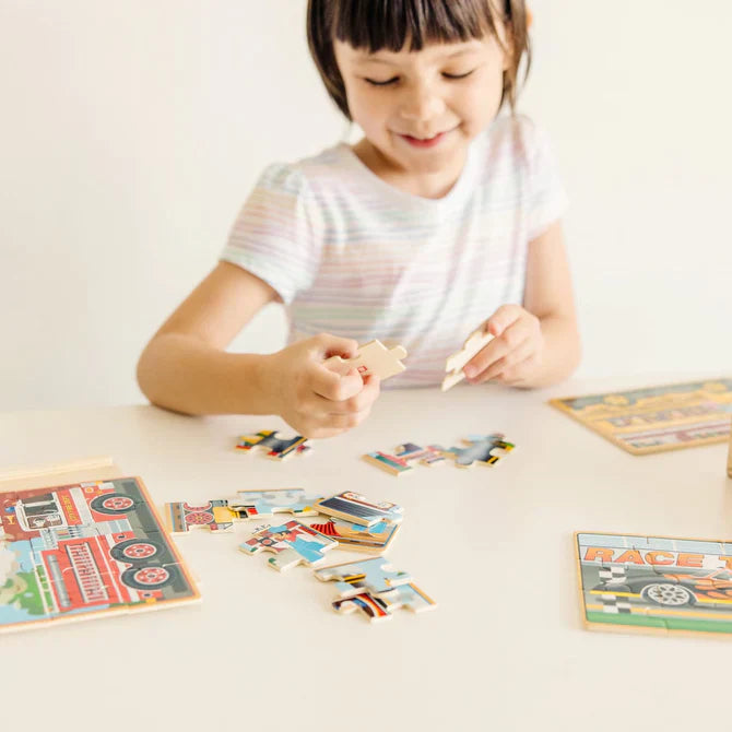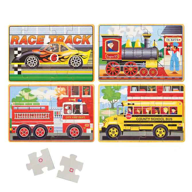 - Contains four wooden puzzles: race car, steam engine, school bus, and fire engine